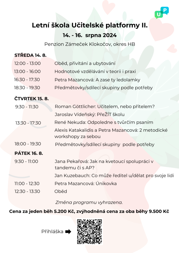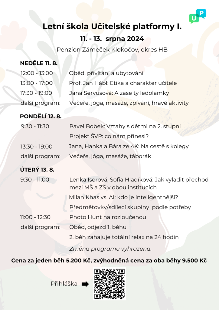Vyrazit s námi můžete ve dvou termínech 11.–13. srpna nebo 14. – 16. srpna 2024. Cena za jeden běh je 5.200 Kč, zvýhodněná cena za oba běhy je 9.500 Kč. Přihlásit se můžete pomocí formuláře zde. Program na oba běhy naleznete níže. V případě dalších dotazů kontaktujte Janu Servusovou na jana.servusova@ucitelskaplatforma.cz.