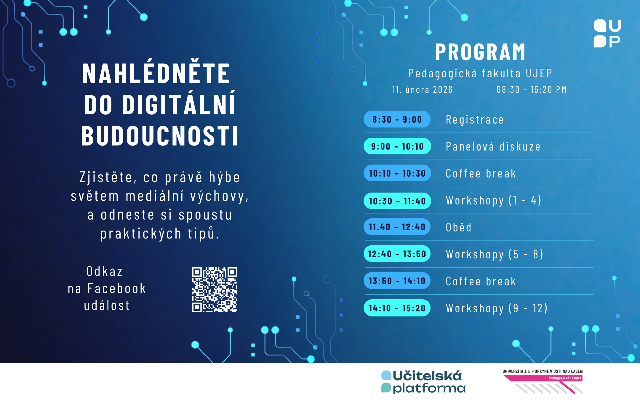 Čeká vás den nabitý inspirací, nápady a praktickými tipy do výuky. Vyberete si z 12 workshopů zaměřených na aktuální témata mediálního vzdělávání a zjistíte, co právě hýbe světem mediální výchovy. Setkáte se se stejně naladěnými kolegyněmi a kolegy, s nimiž společně vytvoříte bezpečné prostředí pro sdílení zkušeností i nápadů.